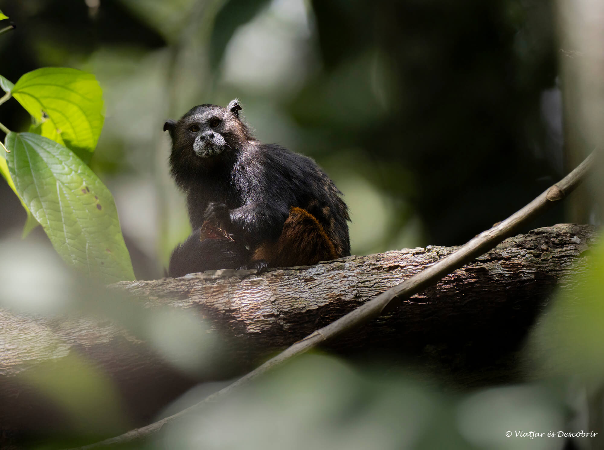 L’endemà, abans que sortís el sol, vaig sortir amb el guia cap a una collpa de lloros: un penya-segat argilós on centenars d’ocells s’alimenten de minerals. Aquell matí, però, la tempesta de la nit anterior havia silenciat el bosc. Només alguns lloros es van deixar veure. La sorpresa del dia va arribar de camí de tornada a la Casa Machiguenga, on ens allotjàvem. El guia, amb aquella capacitat gairebé sobrenatural de percebre el que s’amaga entre la vegetació, va aturar-se de cop. Va escoltar un soroll entre els arbres i va localitzar un grup de titís de cap bru. Mentre els fotografiava, em va fer un gest perquè l’acompanyés en silenci. I allà, a pocs metres, vaig veure’l: un tití emperador, amb el seu bigoti blanc inconfusible, immòbil entre les branques. Era una de les espècies que més desitjava veure, i trobar-lo així, en llibertat, va ser un dels grans moments que vaig viure a la selva peruana.