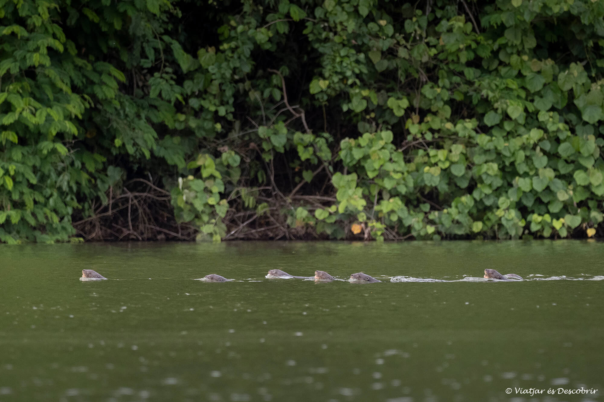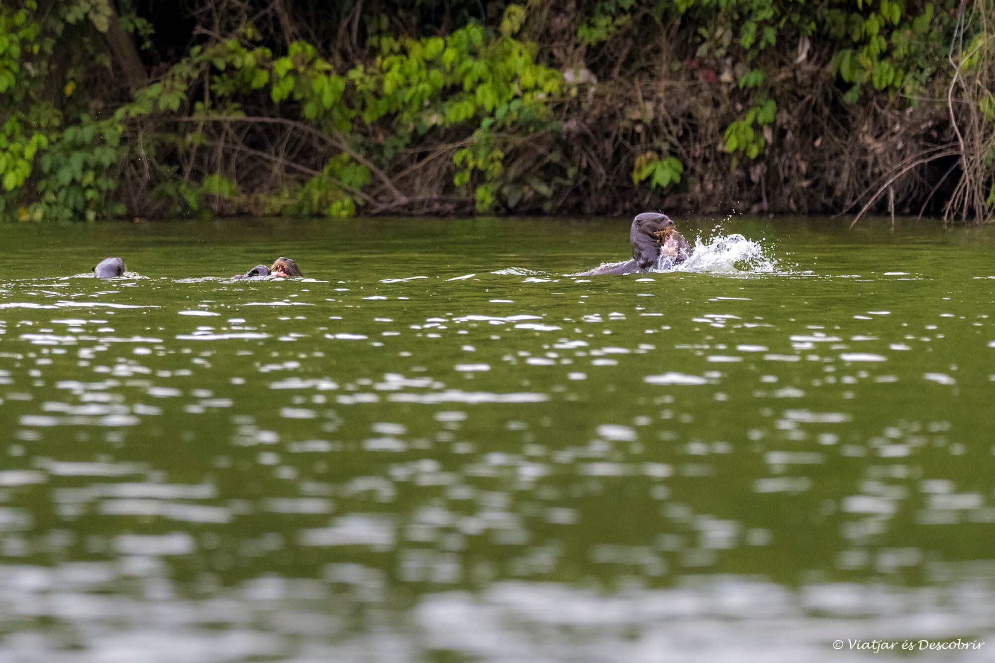 Durant la primera tarda vam sortir a remar per la Cocha Salvador, on hi ha una família residents de llúdrigues gegants. Vam tenir la sort de trobar-les quan ja tornaven al cau. Per evitar interferir en el seu comportament va ser una observació llunyana. Necessitava el prismàtics o el zoom de la càmera pe veure-les amb claredat. Però vaig poder admirar com interaccionaven entre ells, com hi havia algunes petites cries i també com pescaven algunes d’elles, just abans d’entrar al cau. Quan el silenci va tornar a la llacuna, vaig aixecar la vista i vaig veure diversos guacamais creuant el cel, i a la distància, tres micos aluata vermell desplaçant-se amb calma entre les parts altes dels arbres.