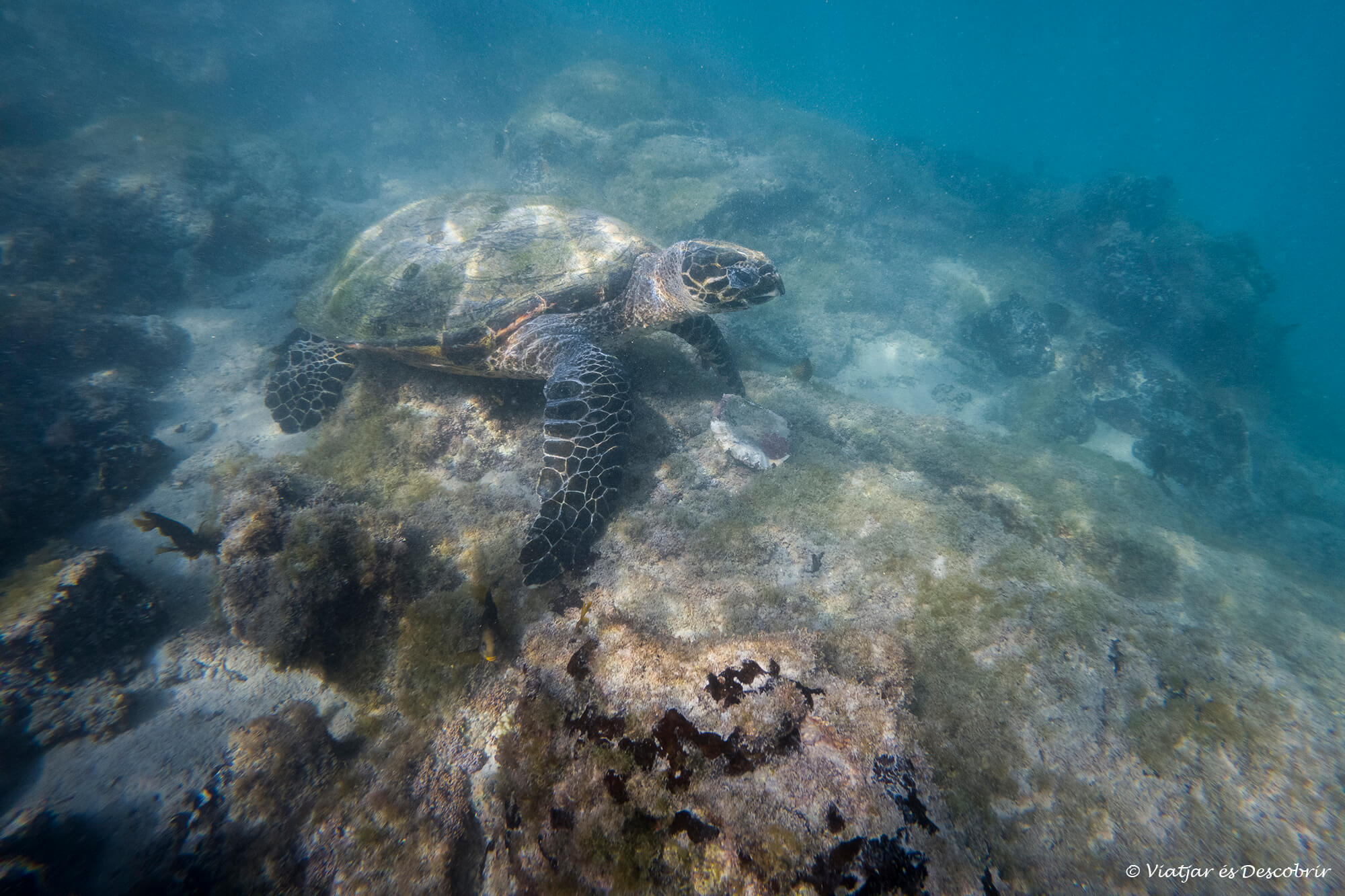 Des que vaig arribar a les Galápagos ja havia perdut el compte de les tortugues que m’havien acompanyat en els meus banys. La majoria eren tortugues verdes, tot i que també vaig tenir la fortuna de trobar algun exemplar de carei. Però res del que havia vist fins aleshores podia comparar-se amb l’experiència que vaig viure en un snorkel a la zona de los Túneles, a l’illa Isabela. En només tres quarts d’hora vaig nedar entre més de vint tortugues